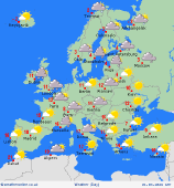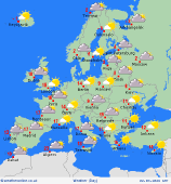 Monday Heavy thunderstorms in much of Spain on Monday although the east should be drier and brighter. Rain, some of it heavy for Portugal. The Balearics should be dry with plenty of sunshine here. More sunshine to come in Corsica and Sardinia as well as most of Italy, although showers for northern Italy. Greece and Turkey will have plenty of sunshine and should be dry too. France should be warm and dry with good spells of sunshine. Fair for the Low Countries and Germany as well as Poland. Hungary stays dry and sunny whilst Austria is dry and bright as well Showers affecting Switzerland, some of them heavy. Mild for Denmark and fair with sunshine. The Baltic States remain fair, sunshine here too. Further sunshine for Finland although cold here. Sweden should be dry and rather mild. Unsettled in Norway with rain and sleet in the west, gales on coasts.