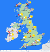 You know that weather you've seen the past few days? That's essentially the weather you'll see today. The very cold northerly wind continues its southward push, brining showers onto northern and eastern coasts and down the Irish Sea into west Wales and southwest England. Inland, there will be plenty of bright, sunny weather. The only change some will notice is a slight easing of the showers in western areas with time. This is the first sign of a change in regime. Locally in central Scotland, highs may only reach -3C. For many, the highs will linger around 0 or 1C, perhaps slightly warmer in Ireland, and up to 5C in far southwest England.