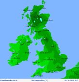 Saturday A band of rain passes east-to-west across England and Wales on a brisk wind in southern areas. West of the band of rain, some brighter spells, particularly in northeastern areas, though always a risk of showers driving in again from the west, particularly northwest England and west Scotland. A milder day with high temperatures at 5 to 9C, up to 11C in southwest England.