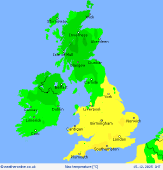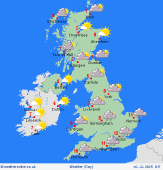 Wednesday Low pressure northwest of Scotland. A windy day with fronts passing from west to east. Periods of rain could be heavy in the west, generally lighter in the east but heavier spells possible here too. The southeast may see some early mist/fog and bright spells before more cloud arrives. Highs at 7 to 10C Britain, a few degrees warmer Ireland.