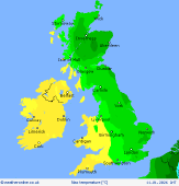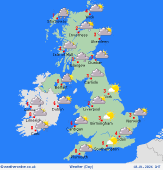 Tuesday A cold front passing east through Tuesday bringing some showery rain to much of England in the morning, clearing the southeast in the afternoon. An occluded front over western Scotland giving some rain here. For other areas cloud is going to be broken and there will be some bright or sunny spells in parts of the Midlands and northeast England. Highs at 6 to 10C.