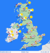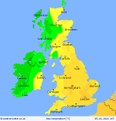 Thursday High pressure east of the country allows for a fair start to Thursday for much of central and eastern England and Wales. Good spells of sunshine, but cloud tending to increase through the day from the west. A band of rain soon arrives into Ireland and west Scotland, edging eastwards through Scotland but then affecting northwest England, western Wales and southwest England. Becoming drier in Ireland, some sunshine in the far west. Staying sunny in southeast England. Highs at 17C in the sunshine in the southeast, 8C in Ireland and western Scotland, though beginning to cool soon after rain passes.